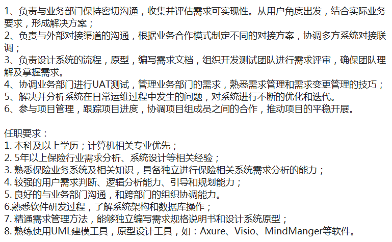 保险公司核心系统经验5年以上,有技术背景+英语可交流为条件,招聘一个BA,薪资20k+,4号线浦电路上班,具体要求看jd,符合的来报名