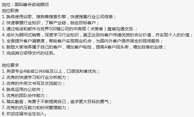 咨询公司要国际峰会咨询顾问(销售) ,要求最好是女生,英语口语流利,本科学历,应届生也可以,综合薪资7-11k,9:30-6:00, 双休,上班地点:7/6号线 高科西路