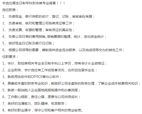 医药公司要出纳,85后,上海人,稳定,专科学历OR,1-2年工作经验的出纳或财务助理,薪资6-7k,14薪,餐补400,上班地点:徐汇区4号线 东安路