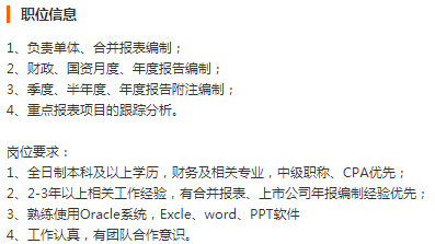 备注【本科或以上,有中级,上市背景,合并过报表,稳定好不要频繁跳】