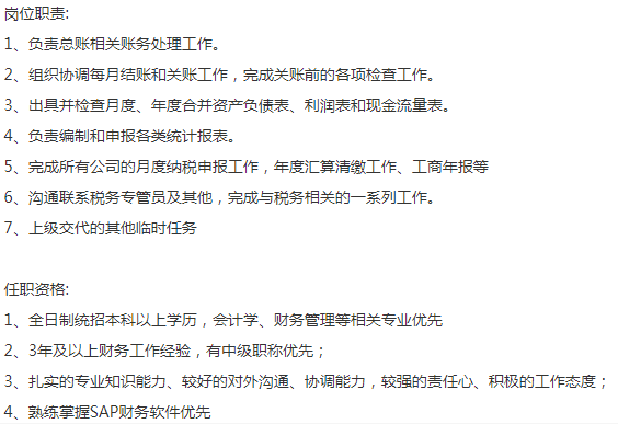 知名化妆品品牌要个总账:全本,有中级,35以下,必须是百人以上规模的企业从业经验,薪资8-10k,12号线虹梅路