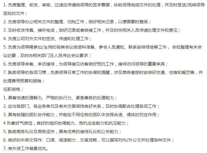 旗下多家上市公司,国内知名集团公司,总部在招一位行政秘书,薪资15-20k,优秀可谈。主要是偏对内的行政工作,文字功底好些,男女不限,女生已婚已育最好。最好海归硕士,英文OK。9号线肇嘉浜路独栋大厦办公
