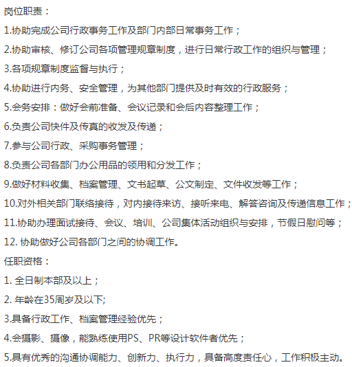 备注【男女不限,全本或以上,35周岁以下,有行政档案管理经验优先,会PS加分 】