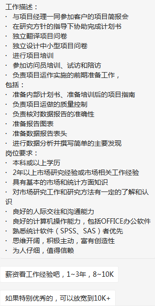 上市咨询公司要市场调研,要求全本以上学历,有至少一年以上相关工作经验,英语书面优秀,口语日常沟通。base8-10k,特别优秀可谈。年底13-14薪,坐标8号线虹口足球场,jd如图