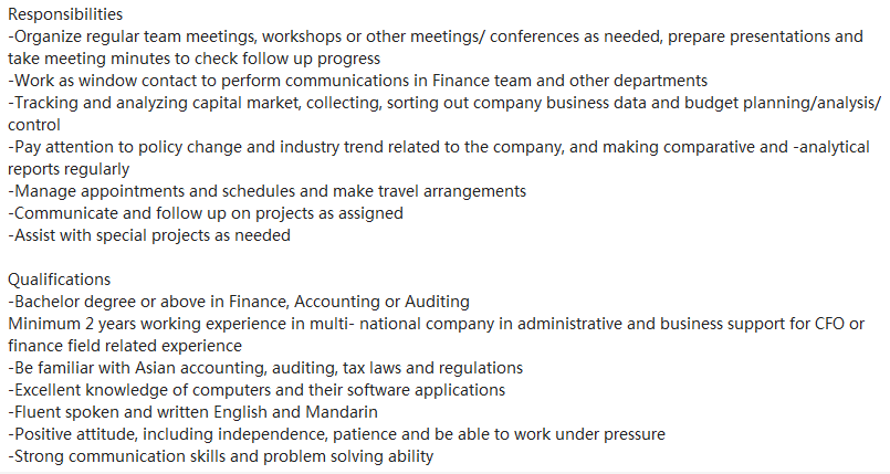 知名奢侈品集团公司,招CFO助理,要女孩子,英文要好,有财务背景,2~3年工作经验,薪资15k左右,年底13薪,五险一金全额缴纳,补充公积金,补充商业保险,9号线徐家汇上班
