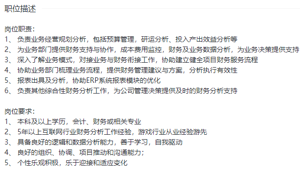 知名一线游戏大咖公司,上海徐汇区上班,急招FA,薪资20-40k*16薪,5年以上互联网行业财务分析工作经验,游戏行业优先考虑,具体如下: