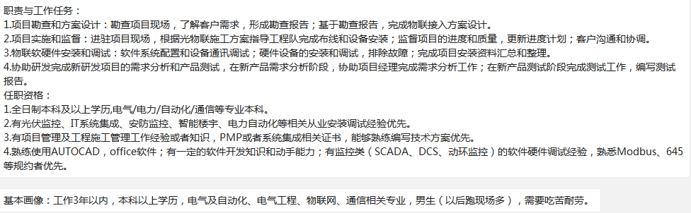 备注【男生,全本,专业偏物联网、电气工程、自动化,应届生也行,能吃苦能出差】