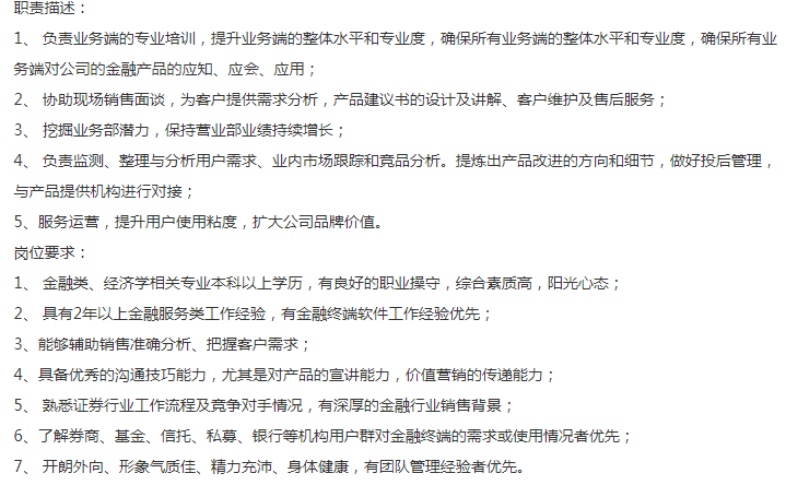 【投资顾问】国内知名金融科技公司,海归硕士应届生优先,金融或金融相关专业,经济贸易专业,市场营销专业+金融行业实习经验/金融知识储备,沟通能力强,对接知名金融证券以及上市公司,可落户,薪资9-10k +全额交金+季度奖金,上班地点:张江高科,jd如下: