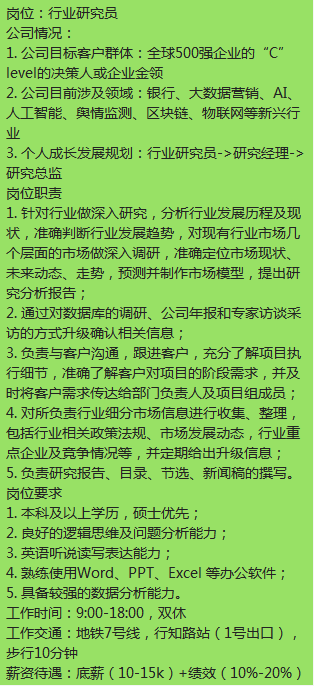 业内知名商务咨询公司要行业研究员,要求硕士学历,文科类专业优,有新媒体公众号微博等文案撰写运营相关经验。base10-15,朝九晚六周末双休。坐标七号线行知路